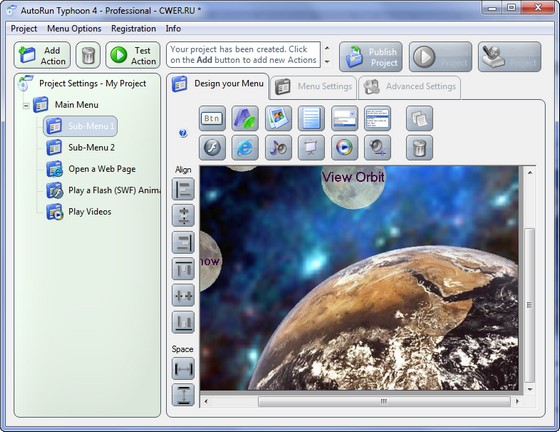 Программа для создания оболочки автозапуска CD/DVD. Сам процесс создания выполнен в виде пошагового мастера, где сборка производится с использованием WYSIWYG - редактора, "Что Вижу То и Получаю", простым перетаскиванием необходимых элементов, по окончании которого у вас будет возможность определить несколько параметров. Из возможностей следует отметить возможность добавления окна запуска (splash screen), которое будет появляться когда диск вставлен в дисковод, кроме того, автозапуск диска можно защитить паролем, выбор программы просмотра для определённого типа файлов и др.