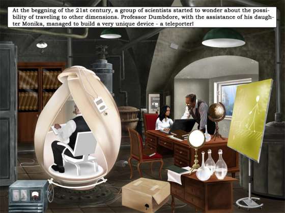 Моника и её отец профессор Дамбдор изобрели уникальный прибор - телепортатор, который позволяет путешествовать в параллельные миры. Внезапно исчезает отец Моники и ей придётся найти его и вернуть обратно домой. Исследуйте различные миры и встречайтесь с интересными персонажами.