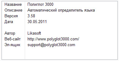 Полиглот 3000 (или сокращённо П3000) – это автоматический определитель языка, который предназначен для быстрого и корректного определения того на каком языке написан введённый Вами текст. Программа работает в операционных системах Windows 95/98/NT/ME/2000/XP/Vista/7.