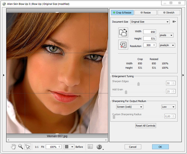Blow Up - плагин предназначен для увеличения размеров изображений с максимальным сохранением их качества. В отличие от других решений для увеличения, Blow Up может масштабировать картинки до 3600 % (в шесть раз в каждом измерении), и при этом на них не появляются такие артефакты, как эффект расчески, ореол и разводы. Blow Up может работать в режимах CMYK, RGB, Lab, Grayscale, и Duotone, справляется с обработкой файлов, которые содержат несколько слоев (при этом сводить их не нужно) и работает с 16- и 32-битными изображениями, в том числе RAW и HDR. Еще одна возможность плагина - сохранение нового изображения в виде отдельного файла, когда исходная картинка остается нетронутой.