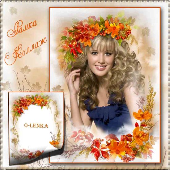 Многослойная рамка с осенними листьями, цветами и девушкой с ярким зонтом.