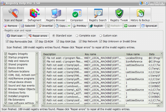 Программа чистит реестр Windows для повышения производительности и стабильности системы. Все найденные проблемы реестра помечаются по степени важности (High, Medium, Low). RegDoctor использует "умный" высокоскоростной алгоритм для точной идентификации неправильных и отсутствующих записей реестра, что обеспечивает сочетание скорости и эффективности работы программы. Есть функция быстрой чистки реестра при каждой загрузке системы.