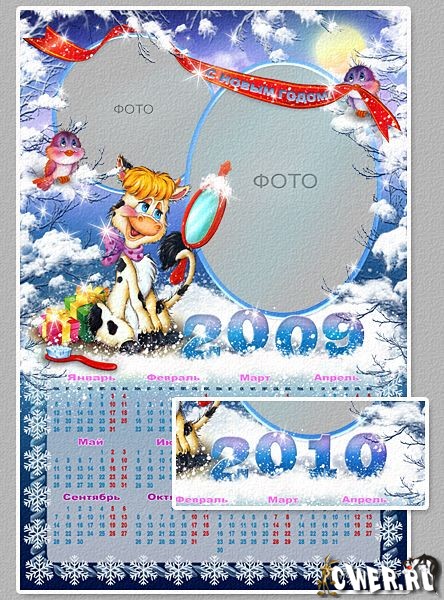2 календаря на 2009 год в psd формате, слои скрыты, размер 2094x3142 пикс, А4 формат, возможность подстановки своего фото.
