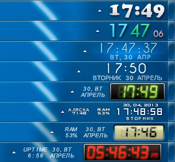 Данная программа преобразит ваши часы в трее, добавит им функциональности и привлекательности. В качестве сигналов данная программа позволяет использовать MP3-файлы. Помимо работы в качестве будильника, программа также может запускать в назначенное время другие приложения, выходить из системы, перезагружать компьютер, выключать его и многое другое. В программе также имеется возможность синхронизации текущего времени с атомными часами. При замещении системных часов, позволяет видеть помимо обычных часов и минут также и секунды, день недели, дату, отсчет обратного времени, показывает время для любой временной зоны. Внешний вид часов можно выбрать из сотен всевозможных вариантов скинов.