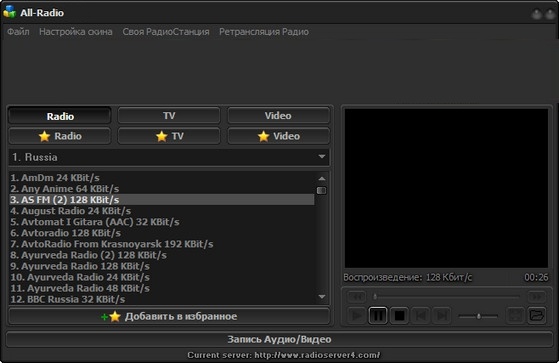 All-Radio - это многофункциональная программа для прослушивания радио через интернет, а также просмотра ТВ и видео. All-Radio распространяется совершенно бесплатно (в программу встроен рекламный баннер, потому за ее использование платит не пользователь, а рекламодатель).