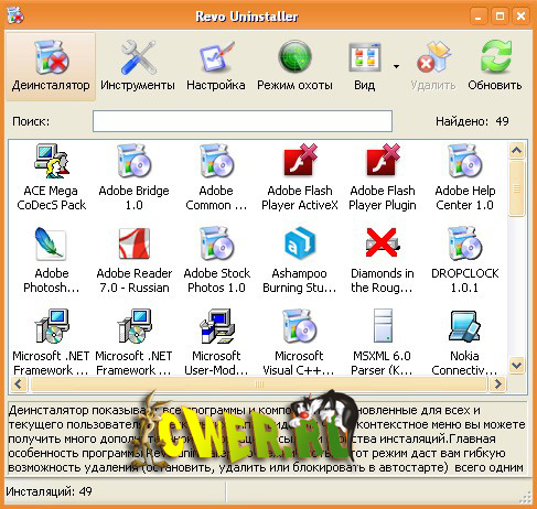 Revo Uninstaller - бесплатная утилита, которая является не просто очередным аналогом стандартного апплета "Установка и удаление программ" операционных систем Windows, а объединяет в себе достаточное количество полезных модулей и компонент для выполнения полномасштабной очистки компьютера. Revo Uninstaller работает эффективнее стандартных средств Windows, благодаря тому, что до и после деинсталляции проводит сканирование системы, обнаруживая и удаляя все внесенные удаляемой программой изменения (файлы, папки, ключи реестра).