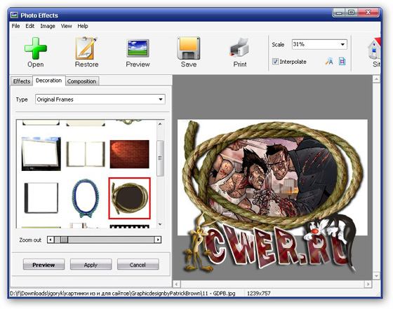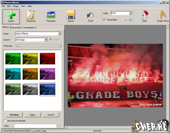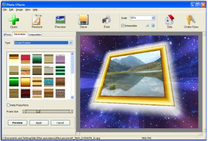 Photo Effects - это программа для обработки фотографий при помощи разнообразных фильтров. С её помощью можно полностью преобразить любое изображение. Программа позволяет использовать более 50-ти эффектов, включая как традиционные, так и оригинальные. Вы сможете увидеть свои фотографии на фоне дождя и снега, в тумане и под облаками, добавить солнечный свет или закружить в потоке тайфуна.