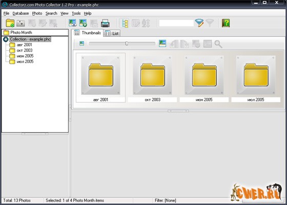 Photo Collector - программа для каталогизации цифровых фотографий и создания фотоальбомов. Photo Collector понимает JPG, GIF, BMP, PNG и TIFF форматы, умеет читать информацию из тегов EXIF и IPTC. При оформлении фотоальбомов можно использовать готовые шаблоны. Доступна обработка цифровых фотографий в пакетном режиме и все основные функции по обработке изображений(яркость, контраст, устранение "красных глаз" и др.). Дополнительные функции: создание фотоальбомов для публикации в Интернете, распечатка отдельных снимков и индексных листов, подготовка и отправка фотографий по e-mail, организация слайд-шоу.