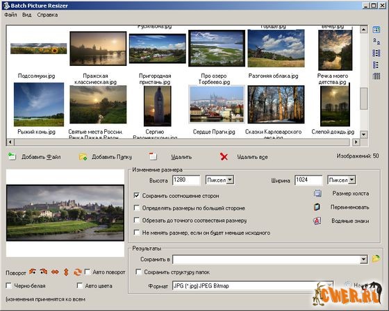 Batch Picture Resizer - программа для изменения размеров изображений, преобразования форматов, пакетной обработки фото, переименования файлов и добавления водяных знаков. Batch Picture Resizer работает с форматами JPG, BMP, TIFF, GIF, PNG, PCX, TGA и др. Утилита может не только изменить размеры фотографий, сохраняя высокое качество и применяя различные алгоритмы интерполяции, но и повернуть или зеркально отразить изображения без потерь качества. Batch Picture Resizer позволяет одним кликом мыши оптимизировать контраст, яркость и цветовые уровни, преобразовать изображения в черно-белый формат, добавить водяные знаки.