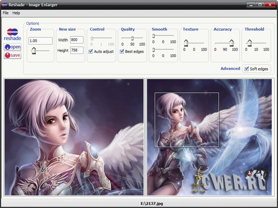 Вы когда либо хотели вмешаться и получить больший контроль над процессом увеличения фотографий? Теперь это возможно, с новыми инновационными технологиями в этом автономном приложении! Простые автоматические настройки программы делают Reshade Image Enlarger прекрасным выбором для начинающих, а наличие расширенных параметров настроек позволяют ее рекомендовать для профессионального использования. Никакой другой инструмент изменения размеров изображения на рынке ( Photoshop и третьи программы включительно) не позволяют вмешаться в этот процесс, как это предлагает Reshade Image Enlarger. Она выдает точное, высококачественное и реалистичное увеличение при любом коэффициенте масштабирования.
