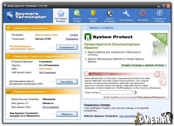 Spyware Terminator - программа для защиты компьютера от различных вредных модулей - spyware, adware, кейлоггеров и других троянов. Имеет резидентный монитор, который в реальном времени проводит мониторинг системы и предотвращает попытки проникновения на компьютер вредоносного ПО.