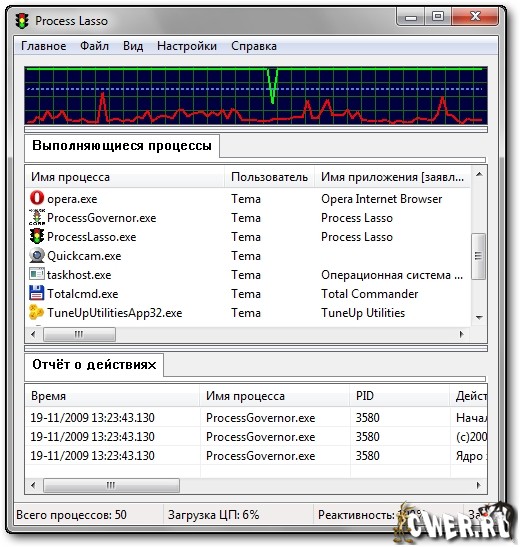 Process Lasso Pro - небольшая утилита, позволяющая вручную или автоматически манипулировать процессами, запущенными на вашем компьютере для достижения максимального быстродействия и стабильности. Эта утилита не является заменой стандартному менеджеру процессов, она, скорее, добавляет новые функции, которые позволяют оптимизировать работу ЦПУ при максимальной нагрузке. Программа дает возможность определить приоритет процессов, причем, по желанию пользователя приоритет будет задан и для всех последующих запусков. Также при помощи этой утилиты можно выполнить завершение работы нежелательных процессов. Кроме этого, программа позволяет вести статистику запущенных процессов. Программа имеет отдельную версию для 64-битных систем, а интерфейс программы обладает поддержкой русского языка.