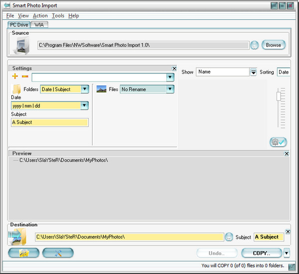 Smart Photo Import - небольшая и быстро работающая утилита, которая поможет Вам в импортировании снимков с цифровой камеры на компьютер. Главная особенность данной программы состоит в том, чтобы импортировать фотографии с вашей цифровой камеры или любого другого устройства (флэшки и т.д.) и автоматически организовывать их в папках на Вашем компьютере. Таким образом Вы не будете должны организовать их позже, и Ваш фотоархив всегда будет в идеальном состоянии.