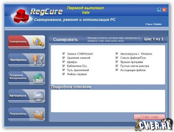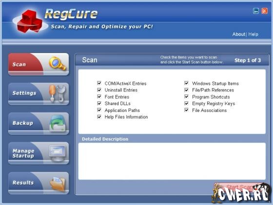 RegCure - программа, которая быстро и эффективно просканирует и очистит системный реестр Windows для того, чтобы ваш компьютер мог работать с максимальным уровнем быстродействия. Эта программа позволит вам удалять ошибки в реестре вручную, в зависимости от ваших требований или автоматически выполнит его тщательное сканирование и очистку. Дружественный пользовательский интерфейс, позволит Вам контролировать прогресс сканирования, настроить RegCure на сканирование в удобное для вас время, а так же удалять и управлять автоматически запускаемые программы.