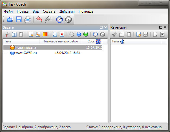 Task Coach - это программа-органайзер для записи текущих дел на самые разнообразные темы, которую можно бесплатно скачать на cwer.ws. Возможно построение древовидной структуры дел, отображение списком и многое другое. Очень проста в использовании, имеет русский интерфейс. Программа появилась в результате неудовлетворенности доступными ныне менеджерами задач, например Outlook или Lotus Notes, которые не обладают инструментами для создания сложных задач. Часто задачи или важные дела состоят из нескольких действий. Task Coach способен составлять сложные задачи.