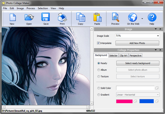Photo Collage Maker - удобная программа для создания оригинальных композиций, состоящих из фона и нескольких фотографий. Создать красивый коллаж в программе можно быстро и просто: достаточно выбрать фоновое изображение из каталога, добавить пару-тройку собственных фотографий и поэкспериментировать с различными эффектами. Программа позволяет также добавлять надписи и украшения. Получившийся коллаж можно просмотреть на полный экран, сохранить или распечатать. Предусмотрена функция быстрого экспорта коллажей в любой из популярных графических форматов. С Photo Collage Maker вы сможете создавать удивительные композиции, не затрачивая на это много времени и сил. Интуитивно-понятный интерфейс, обилие графических материалов в комплекте, а также большое число дополнительных функций помогут вам создать действительно яркий и красивый коллаж.