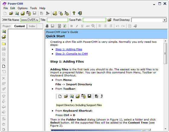 PowerCHM - инструмент для создания профессиональных CHM-файлов помощи из файлов html, текстовых файлов, документов Microsoft Word и Adobe Acrobat (chm из форматов *.doc, *.pdf, *.txt, *.htm, *.html и *.mht). Есть возможность декомпиляции (обратный процесс) на составные части ранее созданного *.chm файла, как одного, так и нескольких сразу (пакетная декомпиляция). Может автоматически генерировать заголовок справки помощи по заголовку или названию файла.