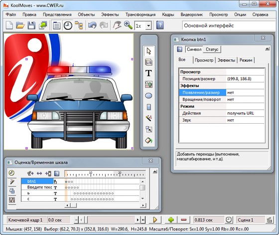 KoolMoves - программа для создания web-анимации, с использованием инструментов для работы с Flash и анимированными GIF файлами. KoolMoves может применять различные эффекты к тексту, импортировать векторную графику, добавлять аудио в формате WAV, осуществлять градиентную заливку созданной кривой, присваивать различные действия кнопкам и изображениям. Благодаря тому, что с KoolMoves работать очень просто, даже не имея навыков работы с Flash, вы сможете создавать превосходные ролики, которые могут быть применены в качестве баннеров, при создании мультимедийного слайд-шоу, создании системы навигации по сайту и т.д.