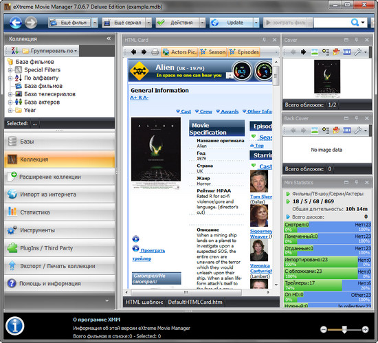 eXtreme Movie Manager - интеллектуальная разработка для ведения домашней фильмотеки. Для каждого фильма предоставлено более 70 полей описания, разделенных по подгруппам. Возможность импорта данных со специализированных сайтов, есть возможность создания собственного импорт-скрипта. Программа поддерживает все существующие сегодня форматы файлов от *.avi и *.mpg до RealMedia. При помощи программы можно не только вести учет коллекции, но и воспроизводить видеофайлы. Программа имеет возможность сканировать диск на наличие имеющихся на винчестере мультимедийных файлов, разрешение которых вы укажете в настройках, и автоматически составляет из них каталог.