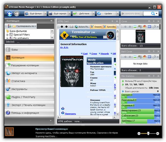eXtreme Movie Manager - интеллектуальная разработка для ведения домашней фильмотеки. Для каждого фильма предоставлено более 70 полей описания, разделенных по подгруппам. Возможность импорта данных со специализированных сайтов, есть возможность создания собственного импорт-скрипта. Программа поддерживает все существующие сегодня форматы файлов от *.avi и *.mpg до RealMedia. При помощи программы можно не только вести учет коллекции, но и воспроизводить видеофайлы. Программа имеет возможность сканировать диск на наличие имеющихся на винчестере мультимедийных файлов, разрешение которых вы укажете в настройках, и автоматически составляет из них каталог.