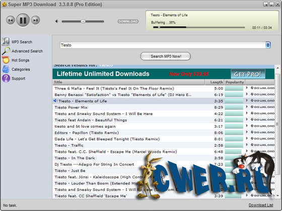 Super Mp3 Download Pro - прямой доступ к бесплатной музыке. Этот mp3 загрузчик надолго обеспечит Вас музыкальными композициями. В мире существуют тысячи групп и исполнителей, предлагающих свое творчество бесплатно. Шанс найти среди них что-нибудь по душе очень велик. Чтобы облегчить Ваш поиск, программа предложит топ сто недели и лучшее в четырнадцати жанрах. Вы сможете сначала прослушать мелодию и лишь потом сохранить её на жесткий диск.