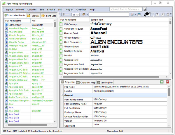 Font Fitting Room - это мощный менеджер шрифтов с предварительным просмотром,который поможет тем, у кого имеются обширные коллекции шрифтов. Предназначен для удаления, добавления и организации шрифтов различных форматов. Поддерживает все типы шрифтов, которые используются на компьютерах.