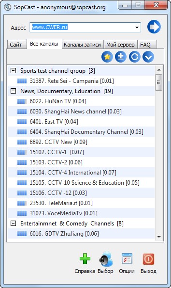 SopCast - утилита для просмотра видеотрансляций через интернет. Скачав ее на cwer.ws, вы сможете просматривать кинофильмы, прямые спортивные состязания, музыку, познавательные или развлекательные каналы и многое другое. Особенностью программы является то, что она работает через P2P сеть, позволяя при этом зарегистрированным пользователям транслировать свои собственные каналы.